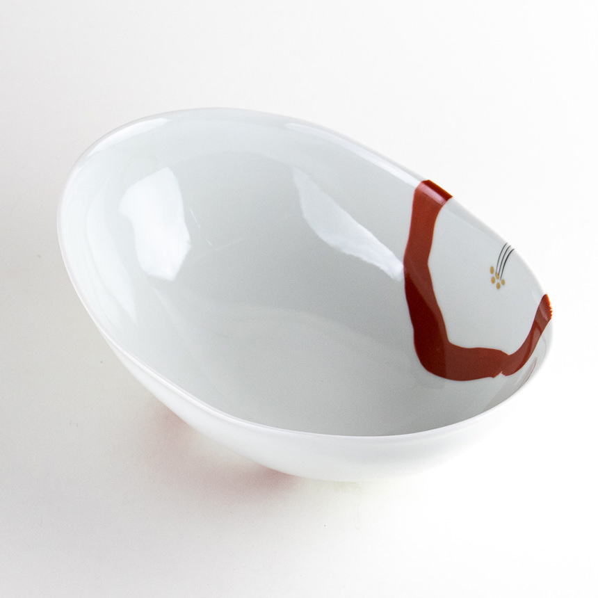 This elegant oval porcelain bowl features flowing red lines and delicate gold accents, combining modern style with a touch of traditional Japanese elegance. Measuring 22.4 cm × 16.5 cm × 8 cm in height, it is perfect for serving salads, pasta, simmered dishes, or assorted platters. Not microwave safe.