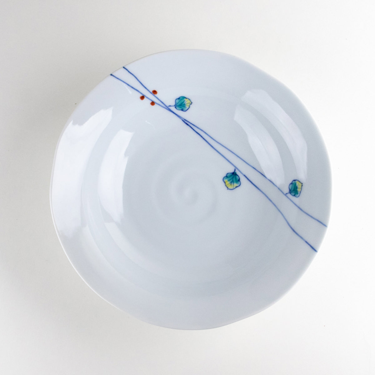 부드러운 백자에 푸른 선과 작은 잎 무늬가 경쾌하게 그려진 다용도 깊은 그릇입니다. 적당한 깊이와 넓은 형태로, 조림 요리, 파스타, 샐러드, 면 요리 등 다양한 음식에 어울립니다. 아리타야키 특유의 고급스러운 질감과 청량한 디자인이 식탁을 더욱 빛나게 합니다.