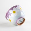 这款煎茶杯以柔和的紫色与淡蓝釉色为底,点缀着洁白的花朵,花心的黄色为整体增添了明快的亮点,仿佛春天的气息。适合盛放绿茶或焙茶,也非常适合作为待客用茶具,营造温馨雅致的氛围。