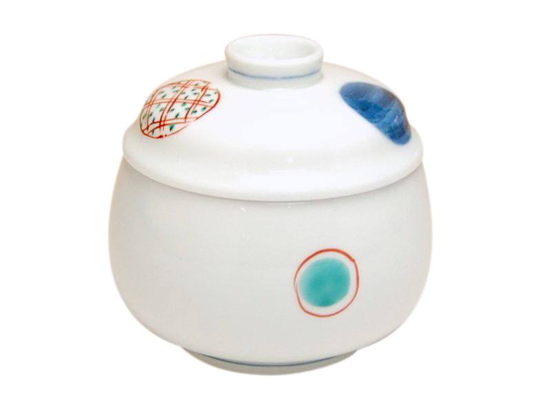 This charming lidded cup is adorned with colorful circular motifs, offering both the smooth texture and durability unique to porcelain. Perfect for chawanmushi (savory egg custard), it can also be used for puddings, desserts, or warm soups. The lid helps retain heat, allowing you to enjoy dishes at their best.