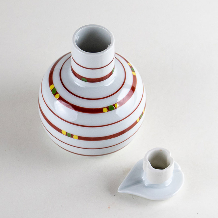 This charming soy sauce dispenser features a playful design of red, yellow, and green dots arranged in rhythmic patterns. The bold red stripes around the body create a crisp, modern look that brightens any dining table. Designed with a spout that minimizes drips and a fitted lid, it combines practicality with style. Made of porcelain in the Arita and Hasami regions of Japan.