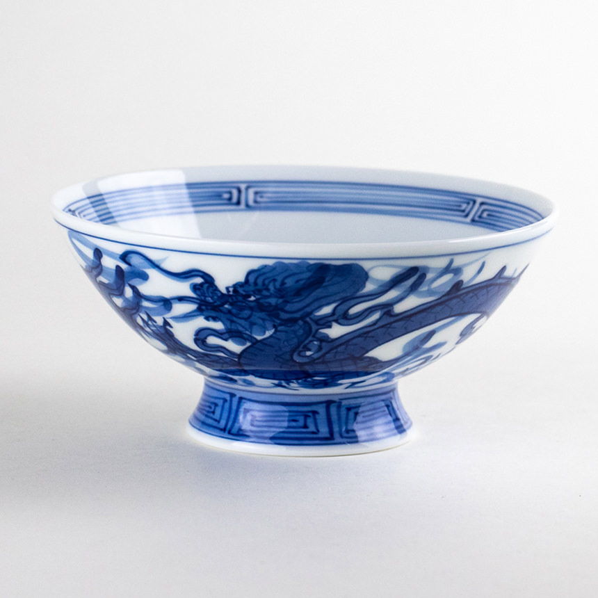 This “Furyu” ochazuke bowl from Arita and Hasami is a beautifully hand-painted underglaze blue work. The powerful dragon motif, depicted entirely in cobalt blue, conveys a sense of strength and elegance inspired by traditional Japanese design. The interior features a refined geometric border, contrasting gracefully with the dynamic dragon on the exterior. With its large size, this bowl is perfect not only for rice but also for ochazuke, donburi, or soup. Ideal for both daily use and as a thoughtful gift.