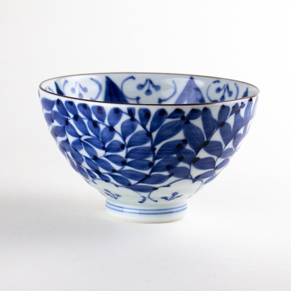 This hand-painted blue-and-white rice bowl features a beautiful leaf motif in rich indigo tones. The rhythmic overlapping of leaves conveys warmth and refinement unique to hand-painted porcelain. The rim is accented with *sabi* pigment, adding a calm and balanced finish to the design. Its large size makes it perfect for rice, ochazuke (tea over rice), small donburi dishes, or soups, enhancing everyday dining with quiet elegance.