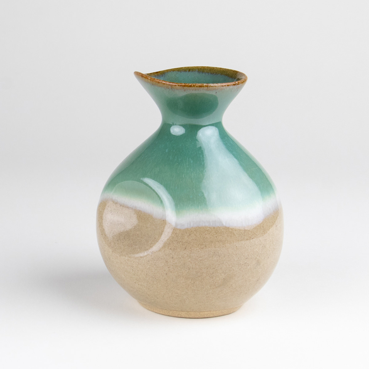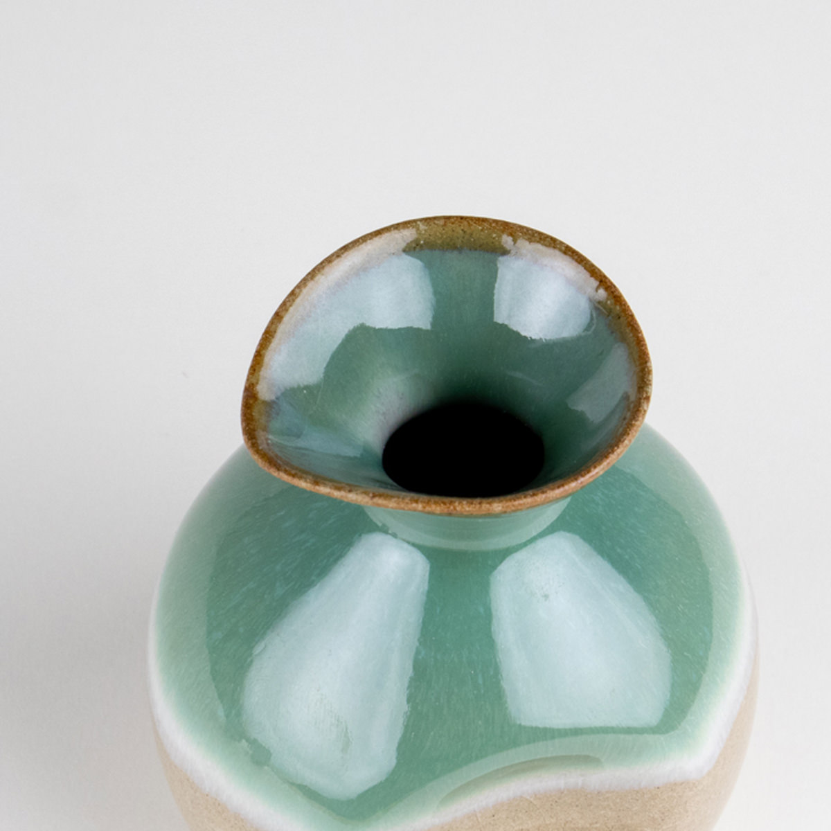这款出自“晩秋”系列的清酒壶,以柔和的绿色釉、白色和土色自然交融,宛如秋末山间的薄雾。约250ml容量,适合日常品酒或待客使用。釉面的光泽与泥土的质感相得益彰,也可作为插花器,为空间增添温暖与宁静之美。