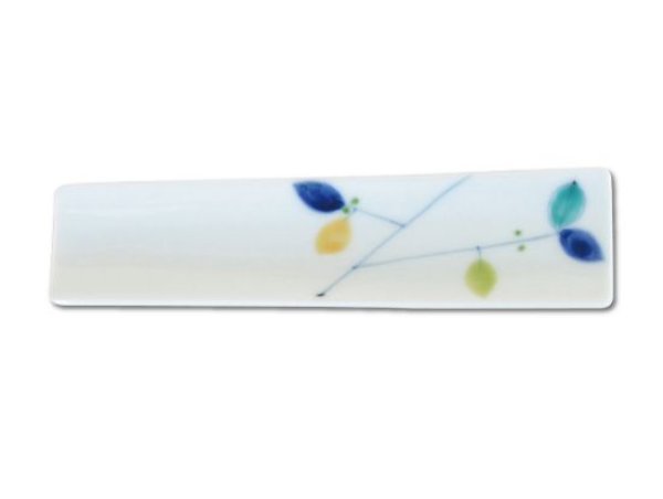 This slim chopstick rest features a refreshing leaf motif in soft colors. Not only ideal for chopsticks, it also serves as a cutlery rest for spoons and forks. The fine porcelain texture and delicate transfer print design showcase the elegance of Arita ware.