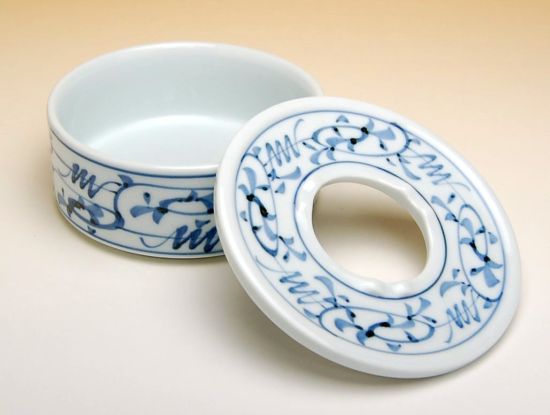 이 유개 재떨이는 아리타야키의 전통적인 ‘소메츠케(청화)’ 기법으로 당초 무늬를 수작업으로 정성스럽게 그려 넣은 제품입니다. 도넛 형태의 뚜껑은 완전히 밀폐되지는 않지만, 재가 날리는 것을 어느 정도 방지해 깔끔한 인상을 유지할 수 있습니다. 컴팩트한 사이즈로 서재나 응접실에 잘 어울립니다.