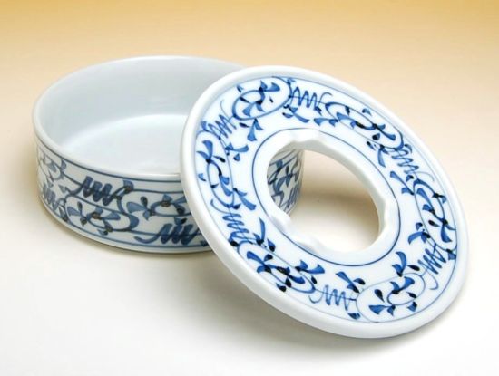 A lidded ashtray from Arita ware featuring a classic blue-and-white arabesque design. The donut-shaped lid is not fully sealed but helps prevent ash from scattering. Its generous 15cm size makes it ideal for smoking areas in shops or at home. Each piece is carefully hand-painted by skilled artisans.