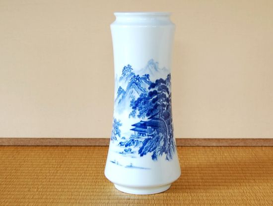 맑고 깨끗한 백자 바탕 위에 섬세한 산수 풍경이 장식된 아리타 도자기 키네형 화병입니다. 날씬한 형태는 가지나 한 송이 꽃을 꽂았을 때 더욱 돋보이며, 차분한 청화 무늬가 일본식과 서양식 공간 모두에 잘 어울립니다. 현관, 도코노마, 거실 인테리어에 이상적입니다.