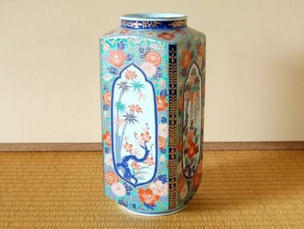 An Arita ware square vase adorned with auspicious motifs such as hibiscus, bamboo, and plum blossoms in vibrant colors. Each side features a unique design, offering a different impression depending on the viewing angle. The refined square form provides stability, making it ideal for displaying branches or tall flowers. It also serves as a striking decorative piece on its own, enhancing the elegance and brightness of any space such as an entranceway, living room, or alcove.