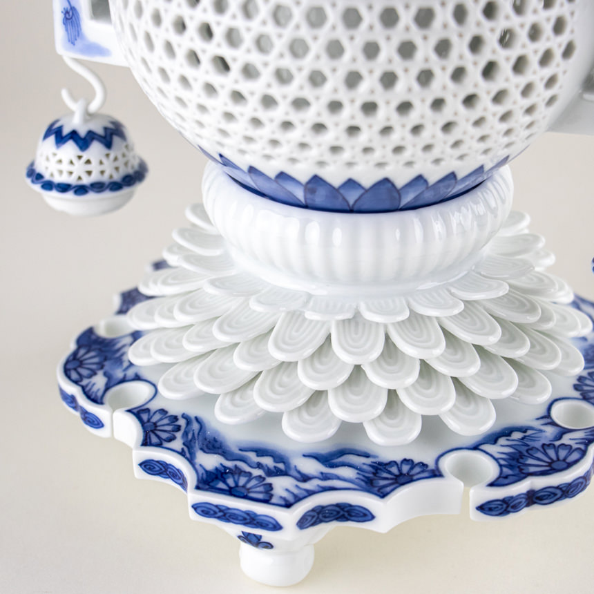 정교한 투각 조각이 돋보이는 이 향로는 장인의 뛰어난 기술력을 보여줍니다. 순백의 자기 위에 감청색 무늬가 더해져 고요하고 품격 있는 아름다움을 자아냅니다. 향을 피우면 섬세한 투각 사이로 은은한 연기가 퍼져 공간을 차분하게 감싸줍니다. 일본식·서양식 공간, 현관, 거실 등 인테리어 장식품으로도 훌륭합니다.