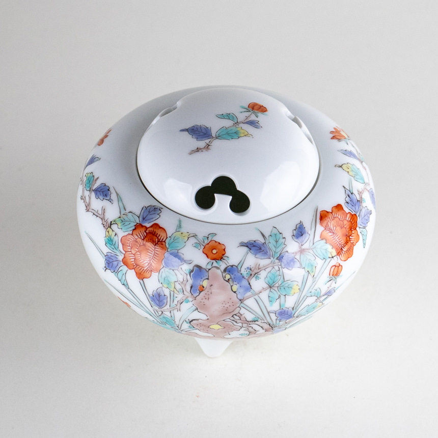 華やかな牡丹と彩り豊かな草花が全体にあしらわれた、かぶ型の有田焼香炉です。赤・青・緑の色彩が調和し、上品な佇まいを演出します。お香を焚いて香りを楽しむのはもちろん、蓋付きの端正なフォルムはお部屋のインテリアとしても映えます。玄関やリビング、床の間などに置けば、空間に華やぎと落ち着きを添えてくれます。