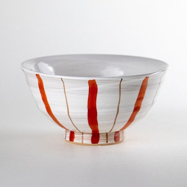 This warm-toned bowl features hand-painted stripes in red and brown on a white slip-glazed base. The soft brushwork gives it a natural, handcrafted charm. Perfect as a rice bowl or for serving side dishes and simmered dishes, it adds a touch of color and warmth to your everyday meals or makes a thoughtful gift.