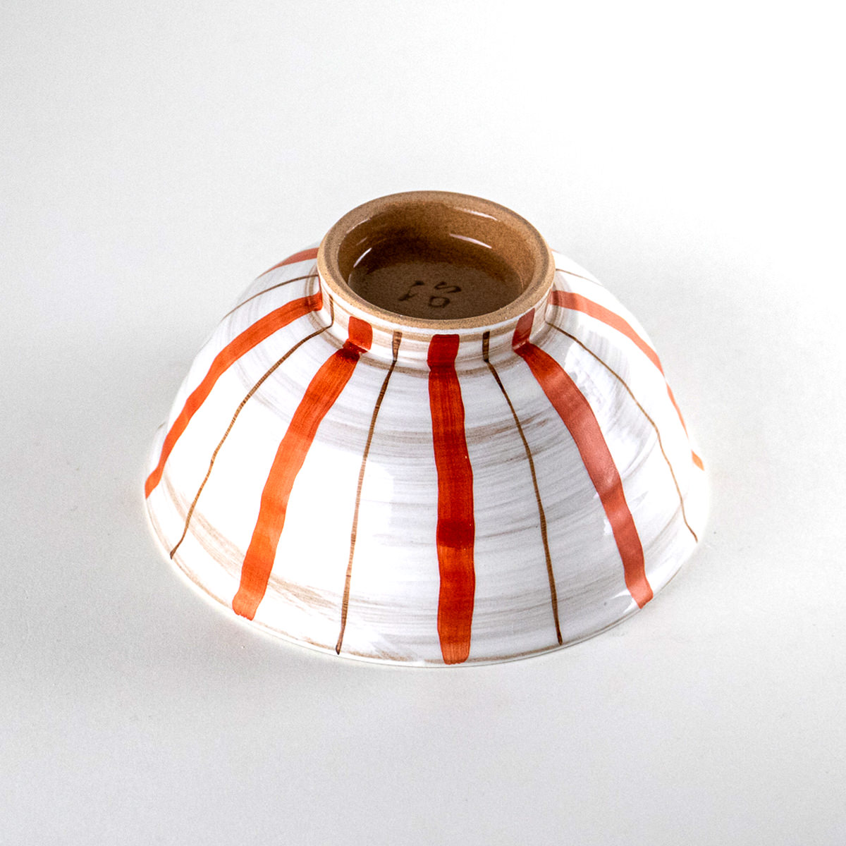 Ce bol en céramique présente un motif de rayures peintes à la main en rouge et brun sur une base blanche. Les coups de pinceau doux traduisent la chaleur du travail artisanal. Idéal comme bol à riz ou petit bol pour des plats d’accompagnement, il apporte une touche de couleur et de convivialité à la table. Parfait pour un usage quotidien ou comme cadeau raffiné.