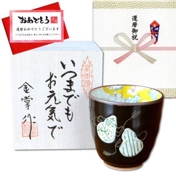 還暦祝い 無病息災を願った縁起物ギフト 有田焼 湯呑み 六瓢色彩 緑 メッセージカード付き・還暦のし付き 木箱入り [60ka-336068]