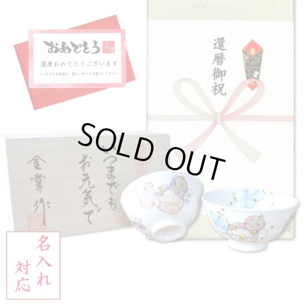 名入れ 還暦祝い 無病息災を願った縁起物ギフト 有田焼 夫婦茶碗 飯碗 ペア 花六瓢 メッセージカード付き・還暦のし付き 木箱入り [name-60ka-312079]