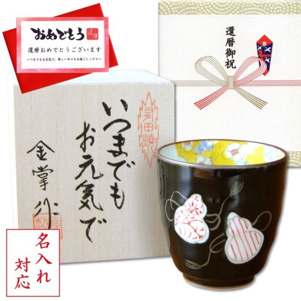 名入れ 還暦のお祝い 無病息災を願った縁起物ギフト 有田焼 湯呑み 六瓢色彩 赤 メッセージカード付き・還暦のし付き 木箱入り