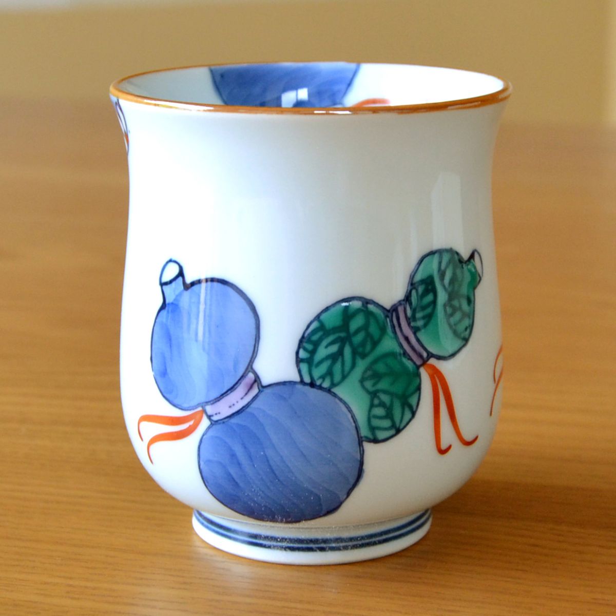 古希のお祝い 無病息災を願った縁起物ギフト 有田焼 湯呑み 鍋島六瓢 青 メッセージカード付き・古希のし付き 木箱入り [70ko-175015]