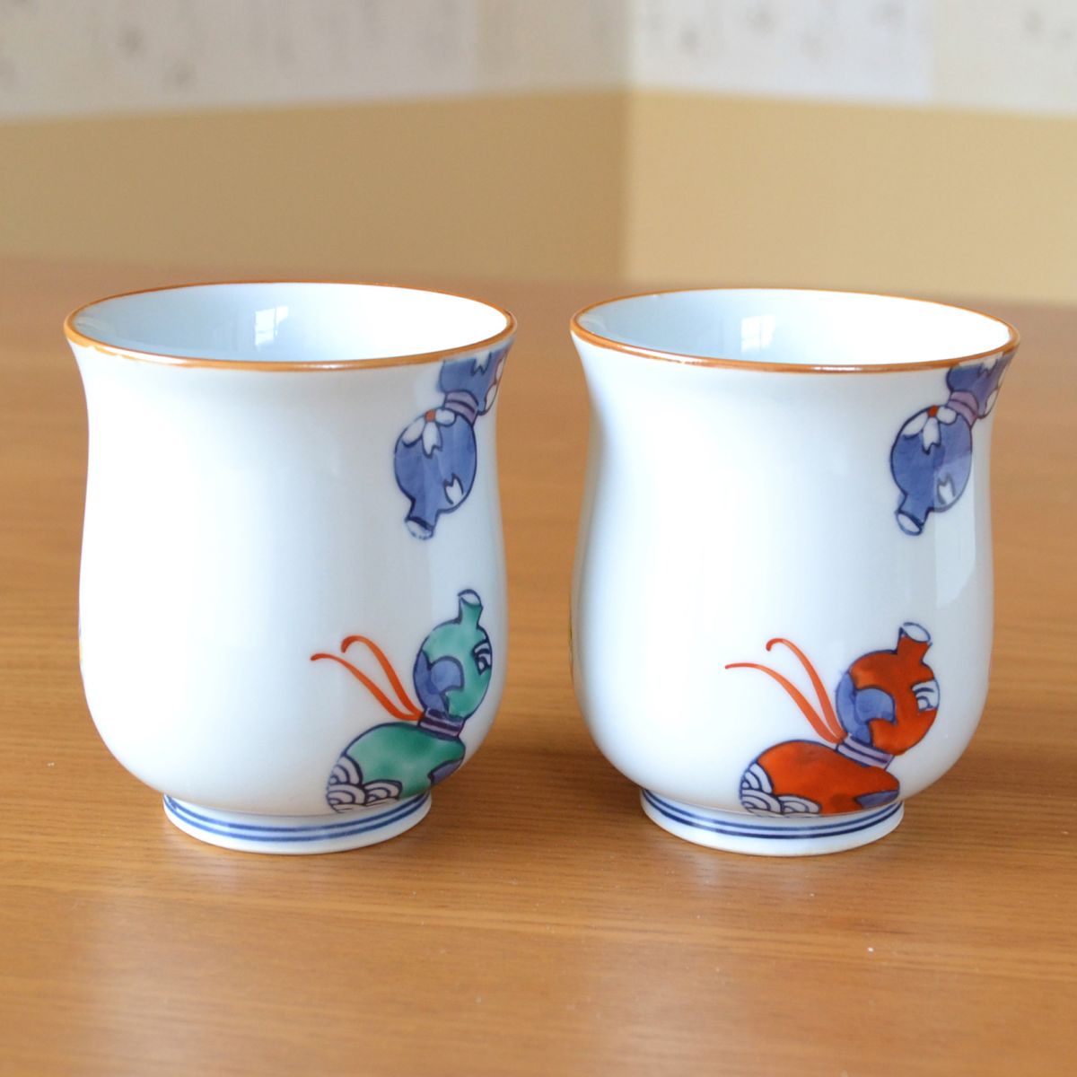 古希 プレゼント 無病息災を願った縁起物ギフト 有田焼 湯呑み ペア 夫婦湯呑 鍋島六瓢 メッセージカード付き・古希のし付き 木箱入り [70ko-175019]
