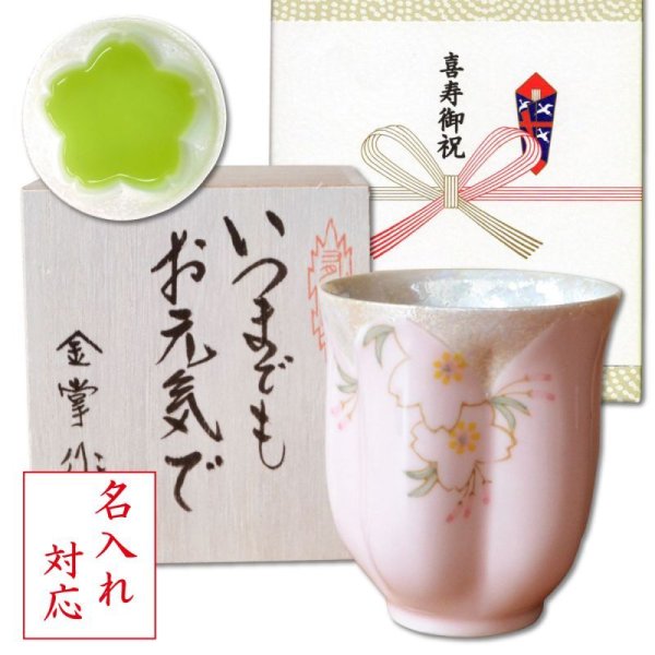 名入れ 喜寿祝い 女性 プレゼント 桜の花びら形になる 湯呑み 有田焼 華の舞 ピンク メッセージカード付き 長寿の木箱入り