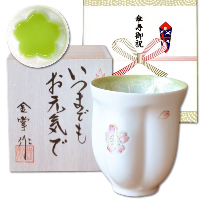 傘寿祝い 男性 プレゼント 桜の花びら形になる 湯呑み 有田焼 舞さくら グリーン メッセージカード付き 傘寿のし付き 長寿の木箱入り [80sa-164089]