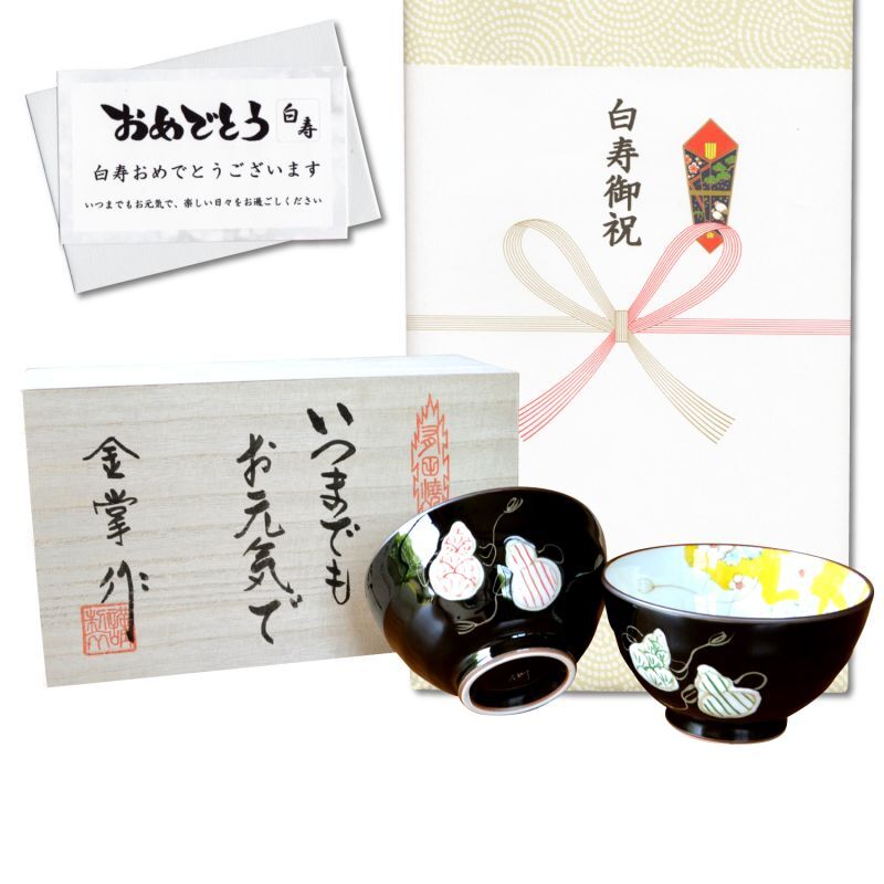 白寿 お祝い 99歳 無病息災を願った縁起物ギフト 有田焼 夫婦茶碗 飯碗 ペア 六瓢色彩 白寿熨斗・メッセージカード付き 木箱入り