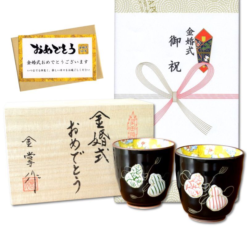 金婚式 プレゼント 無病息災を願った縁起物ギフト 有田焼 湯呑み ペア 夫婦湯呑 六瓢色彩 のし・メッセージカード付き 木箱入り [kinkon-336107]