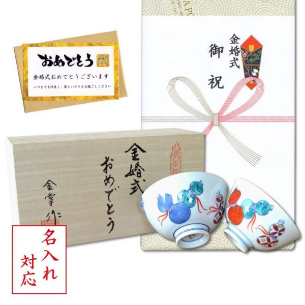 名入れ 金婚式 プレゼント 無病息災を願った縁起物ギフト 有田焼 夫婦茶碗 飯碗 ペア 鍋島六瓢 のし・メッセージカード付き 木箱入り [name-kinkon-175018]