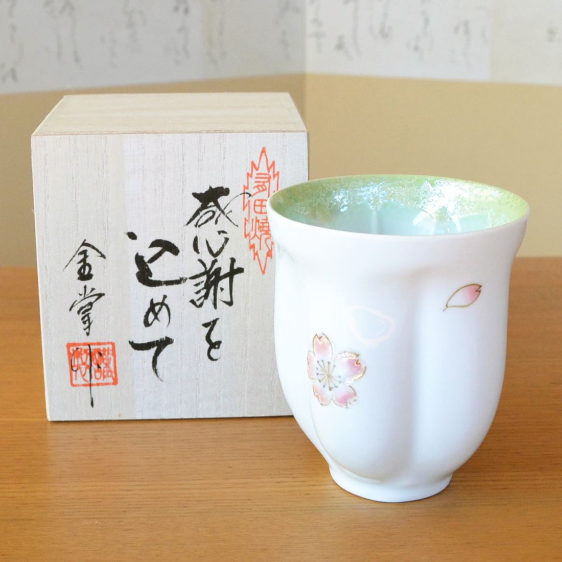 退職祝い 男性 プレゼント 感謝を込めたプレゼント 桜の花びら形になる 湯呑み 有田焼 舞さくら グリーン 感謝の木箱入り 日本製 [kansya-164089]