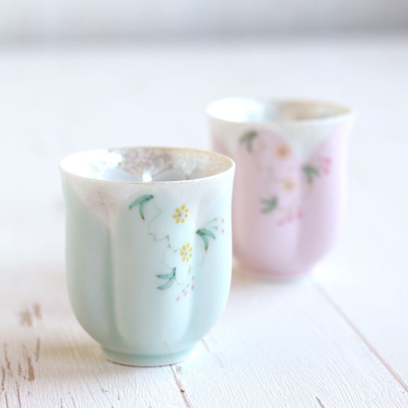 ◇ 水面が「桜の花びら形」になる素敵な湯飲み。内側を精巧に加工した、有田焼独自の技法です。日々の暮らしの中に、ホッとしたひとときを。