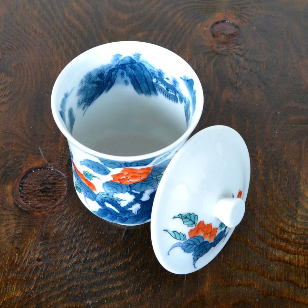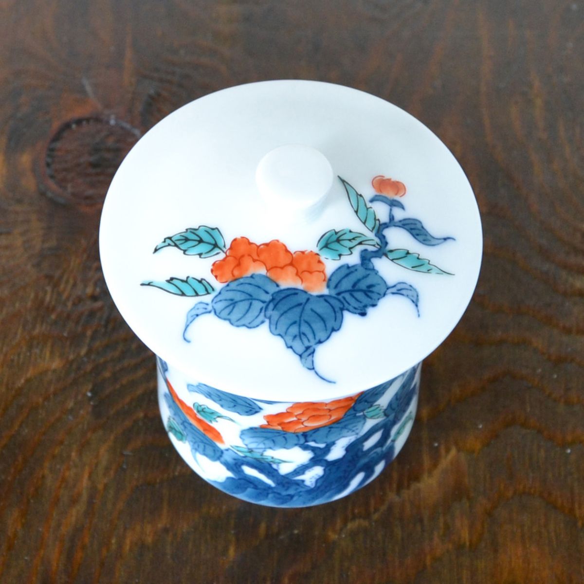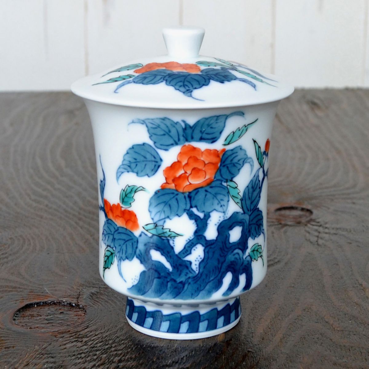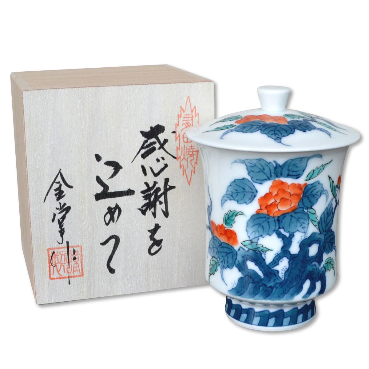 初任給 プレゼント 感謝を込めた木箱入りギフト 両親 おじいちゃん おばあちゃん 湯呑み 有田焼 色鍋島内山水岩牡丹 蓋付き湯呑み大 [kansya-sho-181050]