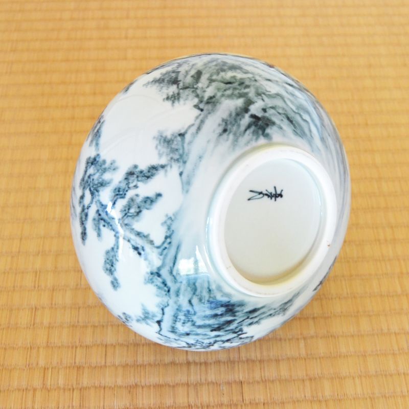 描かれている「山水(さんすい)」とは、山、川、湖、樹木、岩などの自然の風景を主題とし、人間の存在はあまり強調されません。人間や建物が描かれる場合も、自然の広大さの中に小さく描かれます。山水画は、中国の道教や儒教、そして禅仏教の影響を強く受けています。これらの思想は、自然を尊重し、自然との調和を求める姿勢を持ちます。山水画はそうした哲学的・宗教的な背景を反映し、自然を通じて人間の精神的な追求を表現しています。本作のような陶磁器以外でも掛け軸などの水墨画などでよく描かれる題材であり、伝統美術の世界では王道ともいえます。
