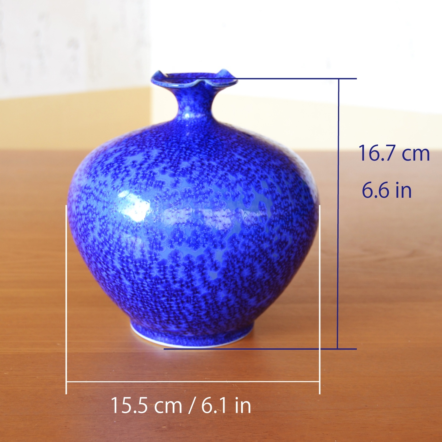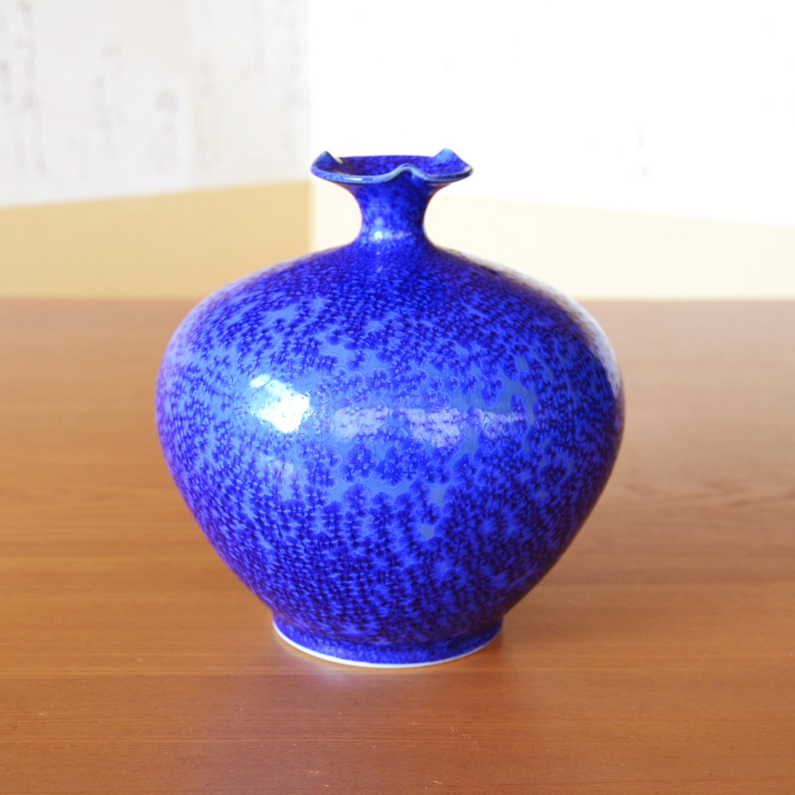 深く吸い込まれるような青(瑠璃)の結晶が美しい花瓶です。
