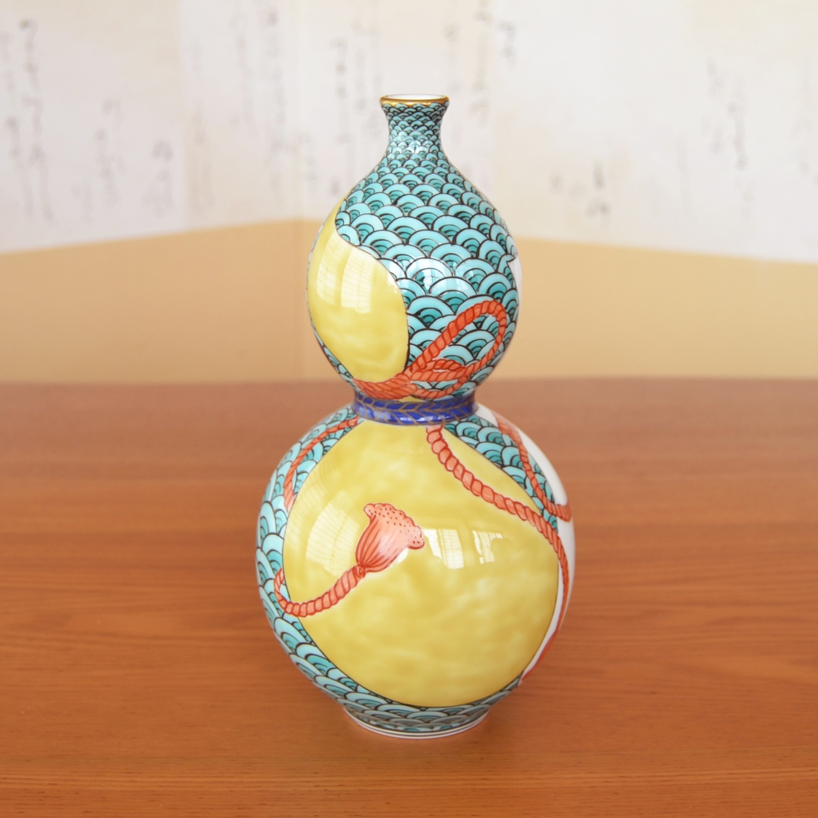 この作品は瓢箪の形をした磁器に、瓢箪そのものの意匠を描いた、洒脱な遊び心のある作品。背景には青海波文様がびっしりと描き込まれ、穏やかな波の重なりが器全体に品格とリズムを与えています。鮮やかな赤の紐や金彩の表現がアクセントとなり、縁起物としての華やかさも十分。