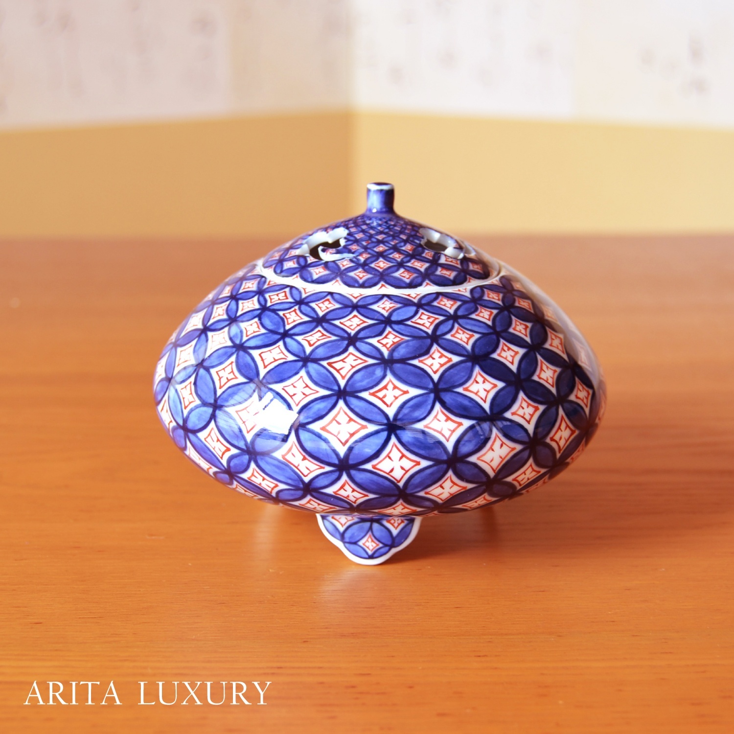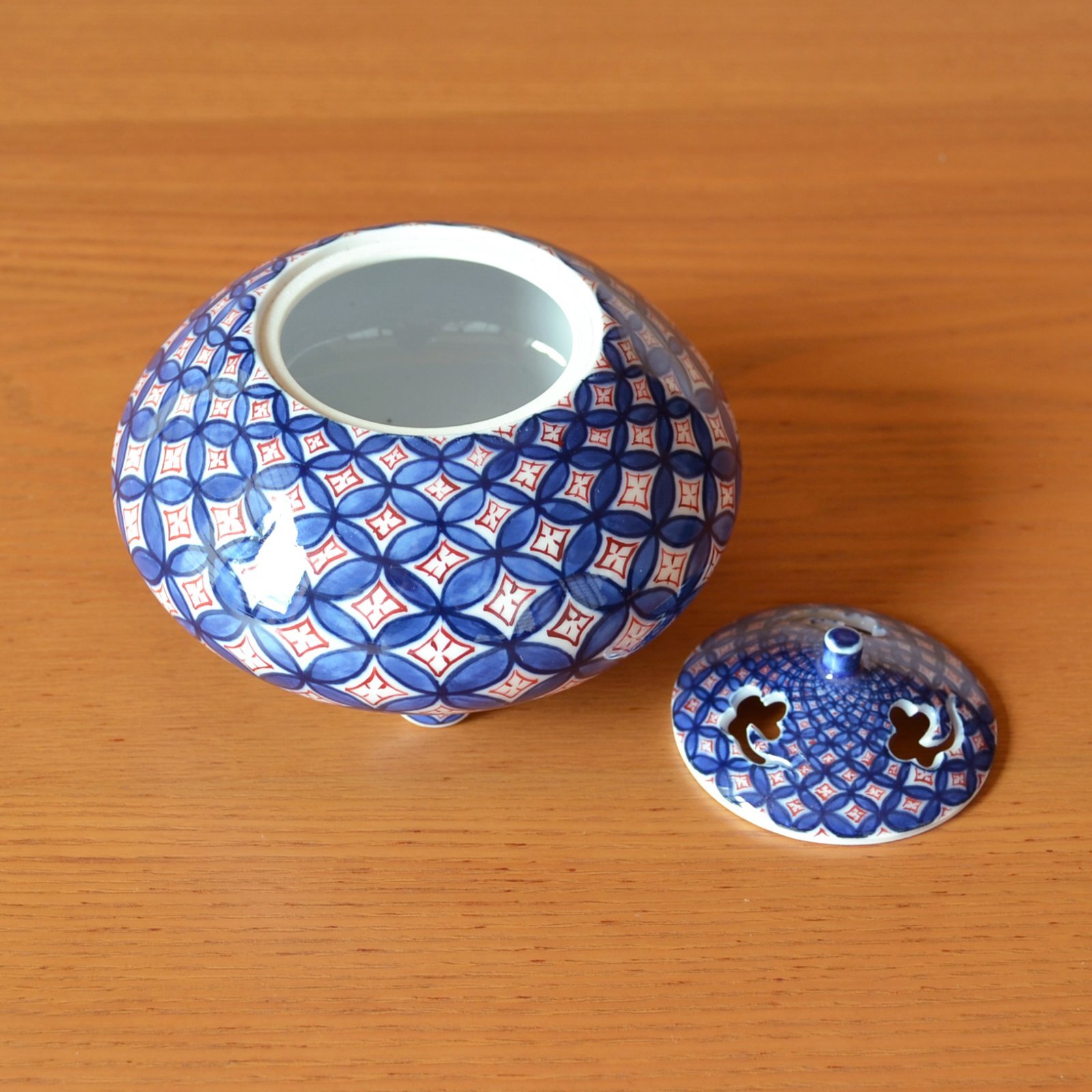 本作では、紺青の染付と朱のアクセントが映える緻密な手描きの七宝柄が、柔らかなふくらみのあるフォルムを優美に引き立てます。蓋には透かし細工が施されており、香の煙が美しく立ち上る設計。実際の香炉としてはもちろん、現代の空間ではオブジェやインテリアアクセントとしても映える逸品です。