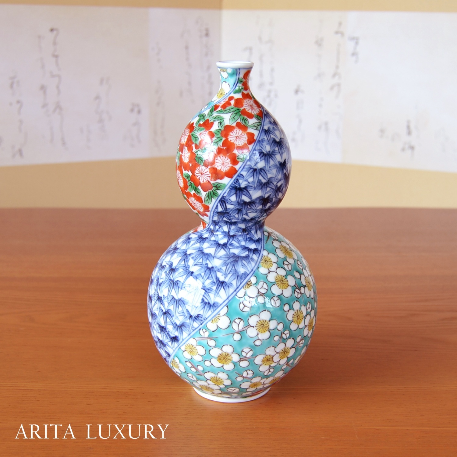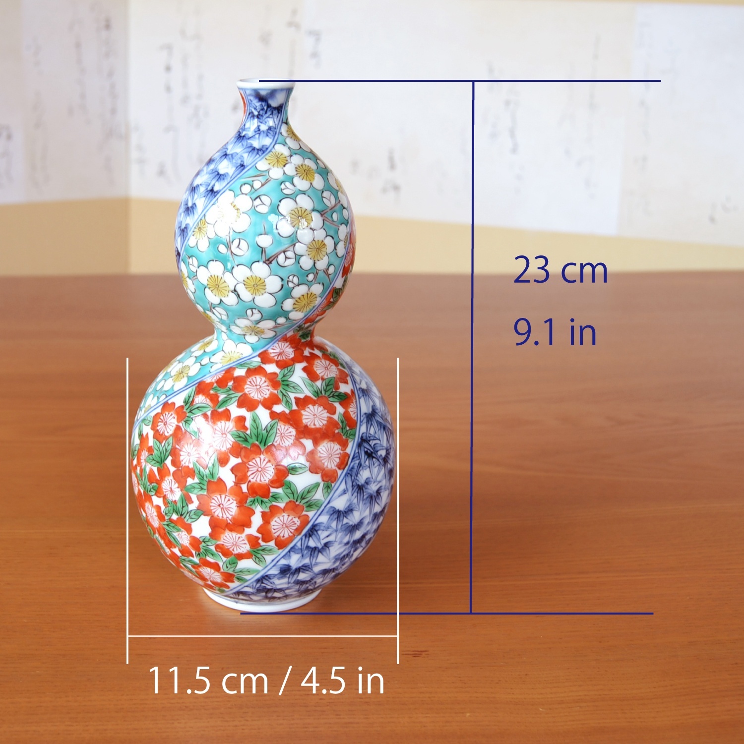 青、赤、緑、白の調和が美しく、どの角度から眺めても異なる表情を楽しめます。高さ23cm、直径11.5cmと飾りやすいサイズながら、その華やかさと密度のある絵付けによって、空間の主役となる存在感を放ちます。縁起の良い瓢箪のかたちと、四季の美を融合させた本作は、贈り物としても大変喜ばれる逸品です。