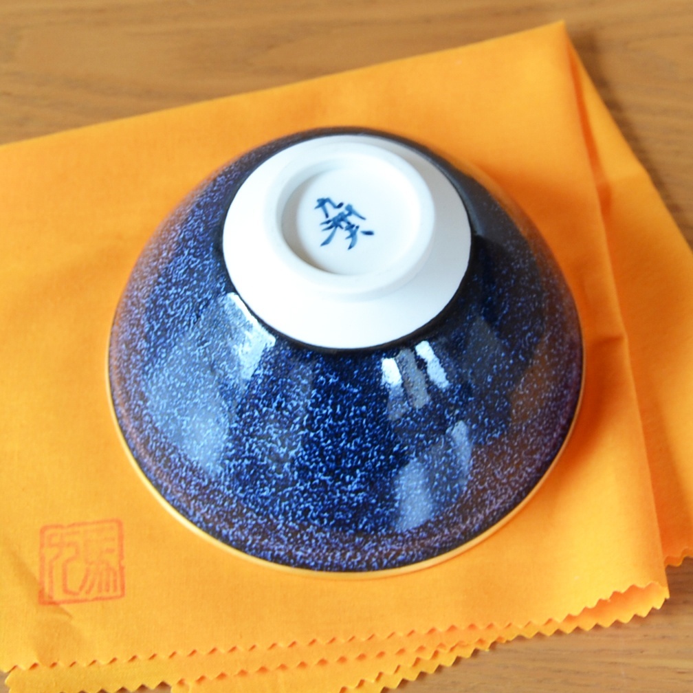 耀変とは、窯の中で釉薬の色や模様が変化する現象で、自然の美しさや神秘性を見ることができます。この作品に使われている釉薬は「銀河」というもので、真右エ門窯が独自に開発した油滴天目の一種。神秘的な夏の夜空を彩る天の川を表現した釉薬です。まるで夜空に輝く星のような深みと美しさのある落ち着いた雰囲気が好評です。