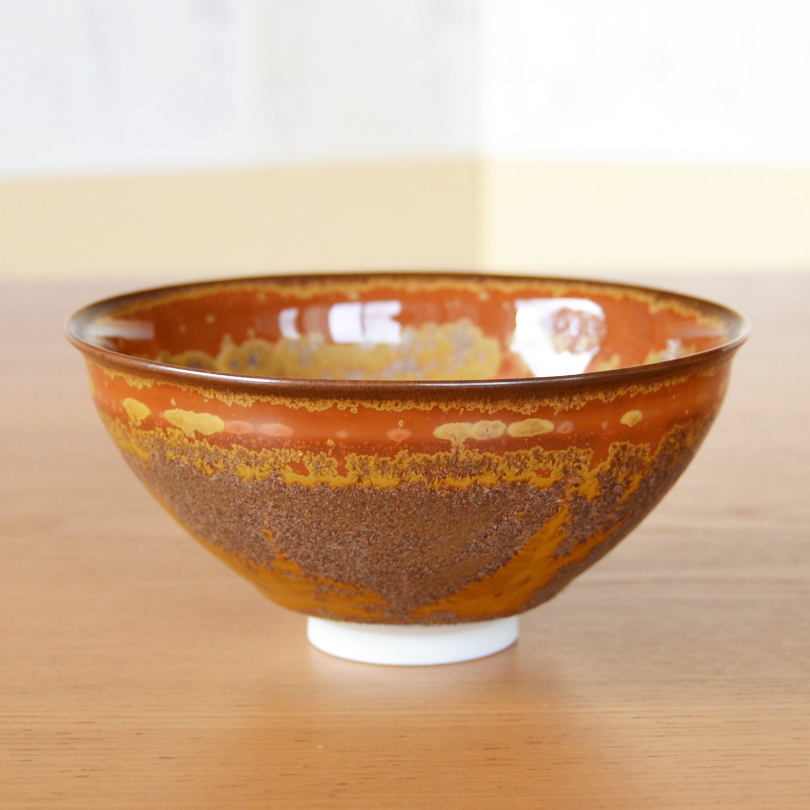 耀変とは、窯の中で釉薬の色や模様が変化する現象で、自然の美しさや神秘性を見ることができます。この作品に使われている釉薬は「金花紋」というもので、金色の花を思い描いた、金花の結晶が美しい作品です。