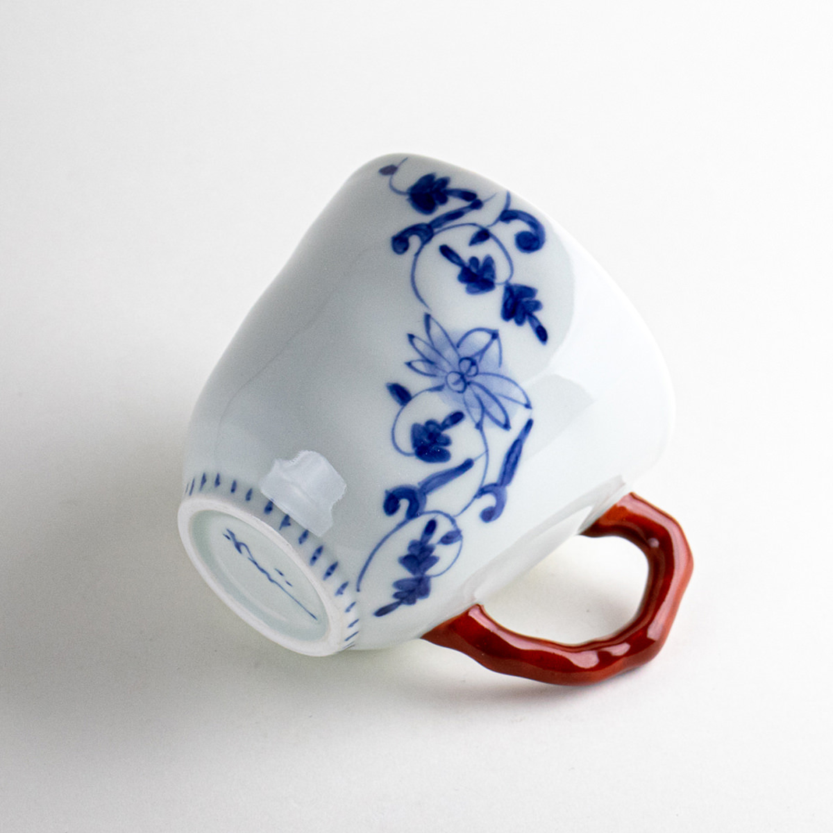 An Arita ware mug featuring a striking combination of a red handle and blue arabesque pattern. Its simple yet elegant design brings a touch of Japanese aesthetics to your daily coffee or tea time. Perfect for everyday use or as a thoughtful gift.