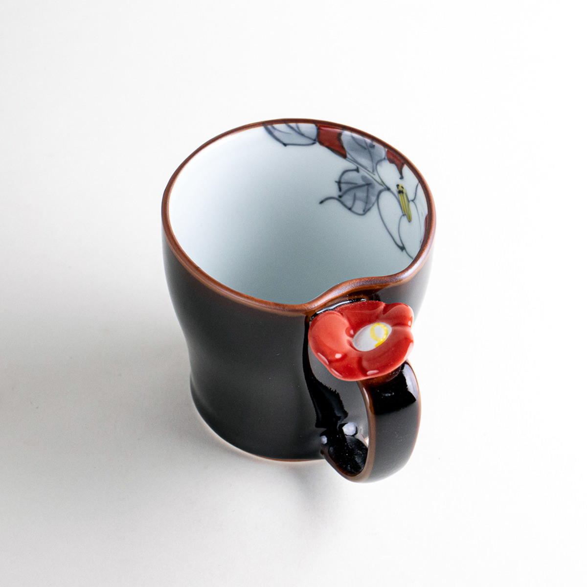 艶やかな黒地に映える赤い椿の立体装飾がハンドルに添えられた、華やかなマグカップです。内側には繊細な花模様が描かれており、使うたびに上品な彩りを楽しめます。お茶やコーヒーはもちろん、来客用としても食卓を華やかに演出します。ギフトにもおすすめの一品です。