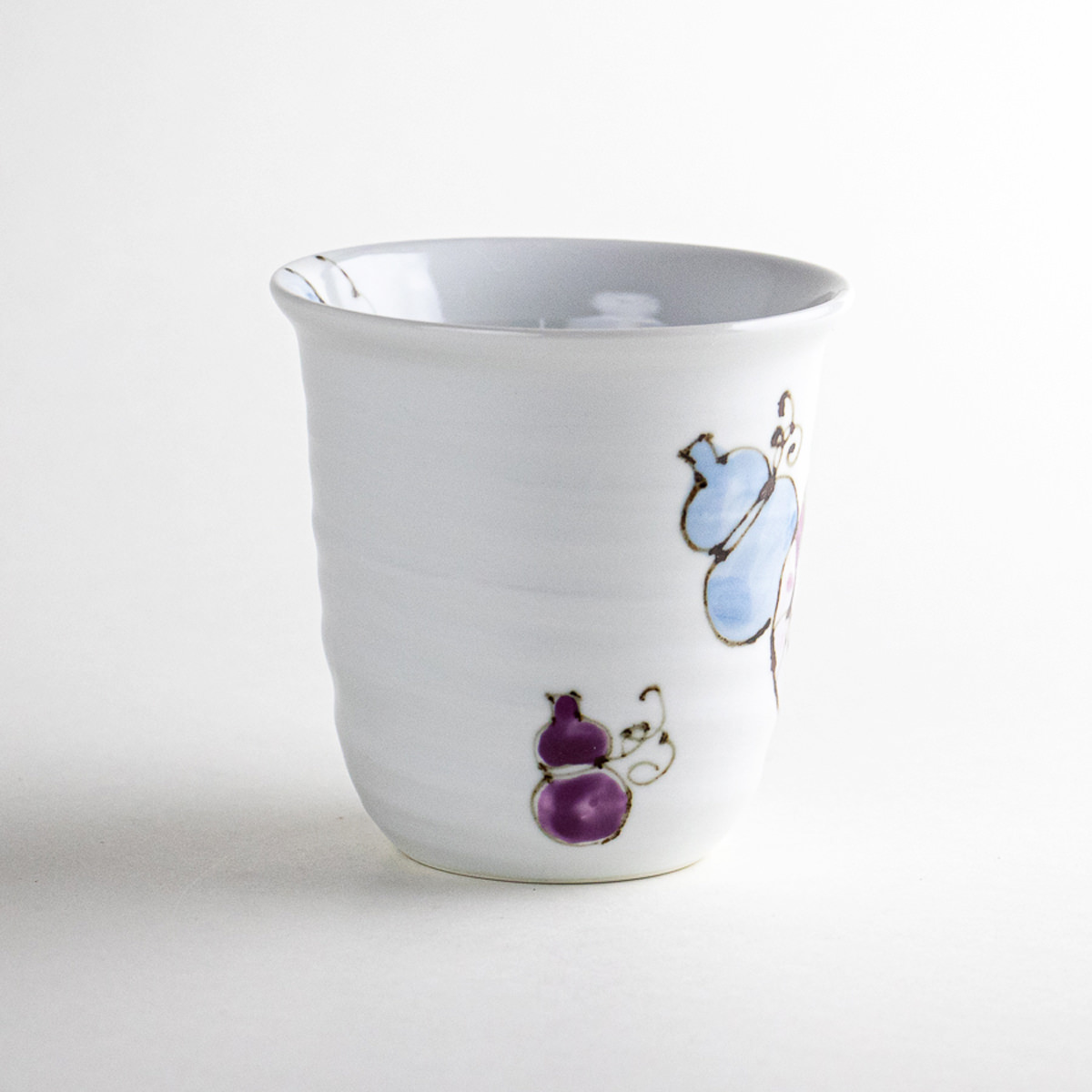 Cette tasse porte-bonheur est décorée de six gourdes, formant le motif traditionnel « Roppyo » (six gourdes), jeu de mots avec « Mubyo » qui signifie « sans maladie ». Ce symbole est depuis longtemps apprécié comme souhait de santé et de longévité. Les tons bleus rafraîchissants apportent une touche de sérénité au quotidien et subliment vos boissons. Idéale pour un usage quotidien ou comme cadeau porteur de vœux de santé.