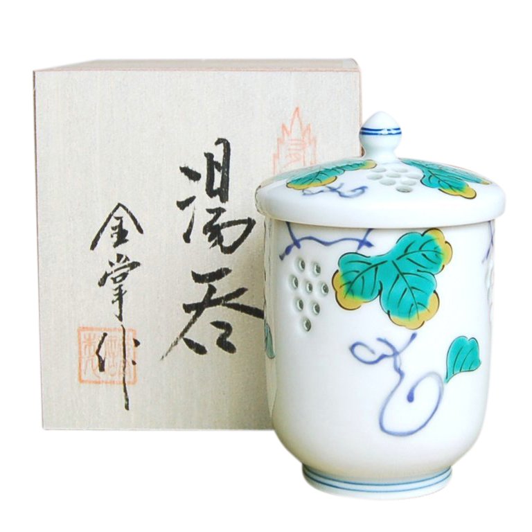 선명한 녹색과 노란색으로 그려진 포도 덩굴 문양이 아름다운 아리타야키 뚜껑 찻잔입니다. 자연의 부드러움과 우아함이 느껴지는 디자인입니다. 수정조각 기법으로 만들어진 투명한 구멍에는 맑은 유약이 채워져, 빛을 받으면 은은하게 빛이 납니다. 뚜껑이 있어 보온성이 뛰어나고 먼지가 들어가는 것을 막을 수 있습니다. 손님 접대용이나 선물용으로도 훌륭한 고급품입니다. “湯呑” 글자가 새겨진 목상자에 정성스럽게 담아 드립니다.