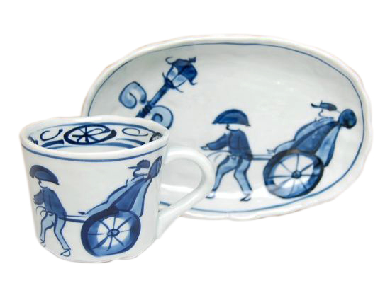 ユーモラスに描かれた人力車の絵柄が印象的な、有田・波佐見焼のコーヒー碗皿です。染付の藍色で描かれた人物と車輪のモチーフが、どこか懐かしく温かみのある雰囲気を漂わせます。手仕事ならではの揺らぎのあるフォルムも魅力のひとつ。コーヒーや紅茶を楽しむ時間を、遊び心と伝統の風情で包み込む一品です。