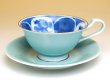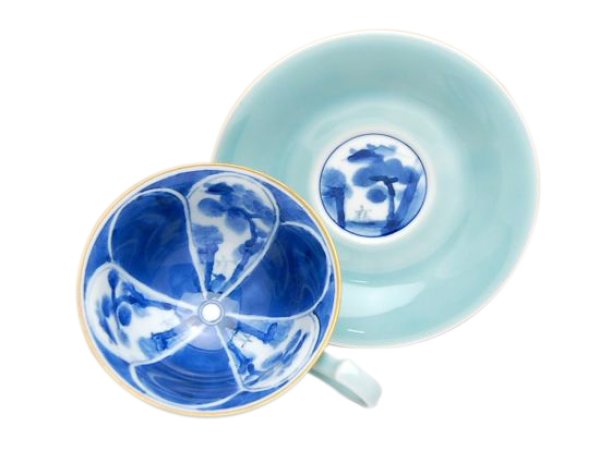 外側は淡く澄んだ青磁、内側には染付で描かれた割山水文様が広がる、上品な紅茶碗皿です。内側の文様は光の加減で深みを増し、飲み終えるたびに景色が浮かび上がるような美しさを楽しめます。金彩の縁取りがアクセントとなり、洋の空間にも調和するモダンな一品です。ティータイムや来客用のセットとしておすすめです。
