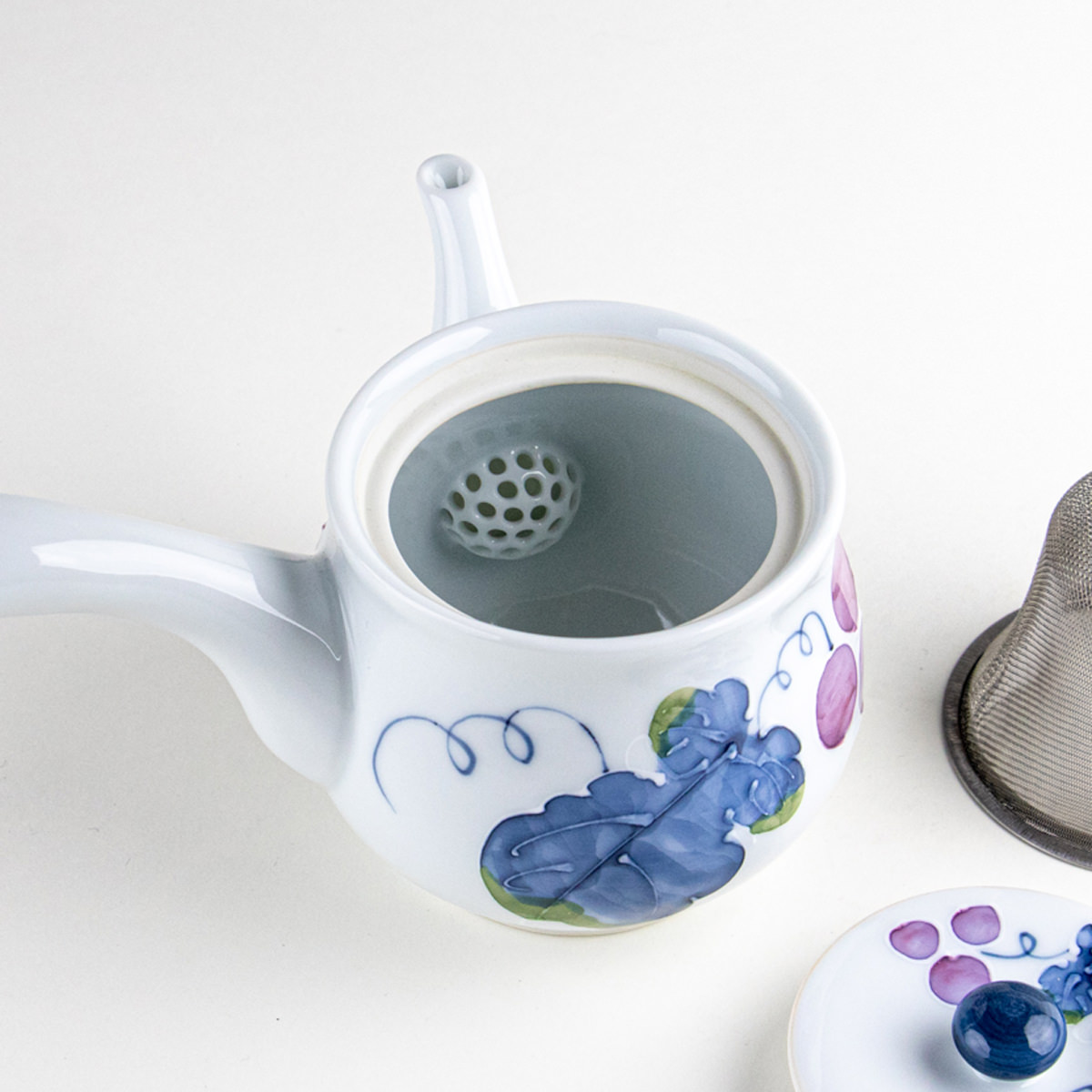 爽やかな色彩で描かれたぶどうのデザインが印象的な小ぶりの急須です。1〜2人分のお茶にちょうど良いサイズで、手にすっとなじむ持ちやすさも魅力。内側にはステンレス製の茶こしが付属し、実用性にも優れています。毎日のティータイムを華やかに彩るアイテムです。