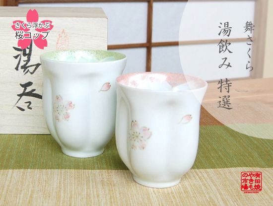 舞さくら (グリーン・ピンク) 桜夫婦湯呑(木箱入)