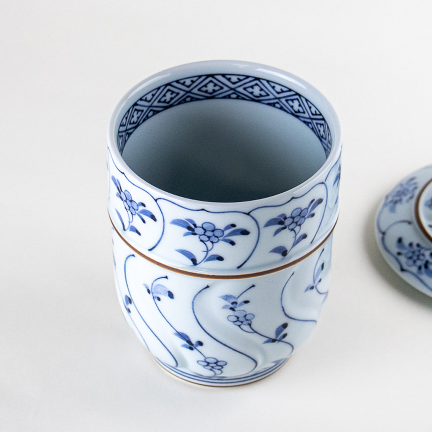 这款特大号带盖茶杯采用有田·波佐见烧制成,以柔和的青花手绘草花图案装饰,给人温雅宁静的印象。容量与寿司茶杯相当,盖子设计可保温并防止灰尘进入,兼具美观与实用性。无论是待客还是日常饮茶,都是理想的选择。