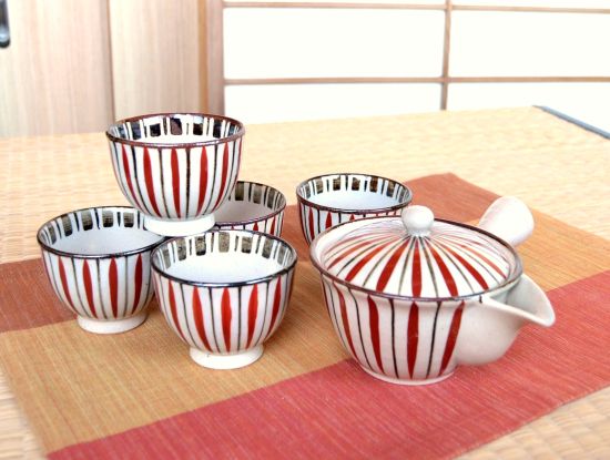 This teaware set features the traditional “Kyoto Tokusa” stripe pattern, hand-painted in iron and red glaze. The rustic clay texture and bold brushstrokes evoke a warm, nostalgic charm. The set includes one teapot with a stainless steel strainer and five lidded teacups, combining functionality with timeless beauty.