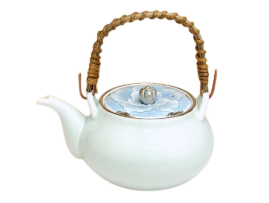 立体感のある質感で描かれた一珍技法による牡丹の花が、蓋の上に華やかに咲く有田焼の土瓶。花芯にはプラチナ彩が施され、上品な輝きを添えています。胴はあえて装飾を控えたシンプルなデザインで、花の美しさが際立ちます。持ち手には天然素材のかずらツルを使用し、やわらかな手触り。ステンレス製の網茶漉し付きで、実用性にも優れています。