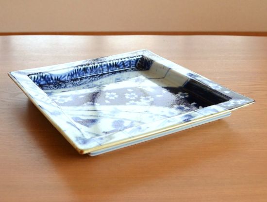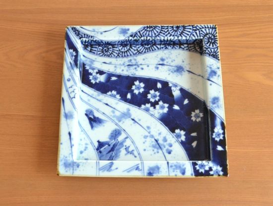 This large square plate features a twisting pattern and cherry blossoms, expressed in deep indigo blue gradation. Measuring approximately 28.5 cm per side, it is perfect for serving sashimi or appetizers at parties. A captivating example of Arita ware craftsmanship.