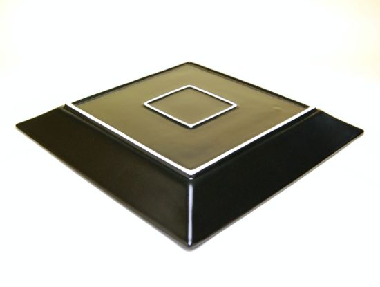A bold square plate featuring a platinum brushstroke circle on a matte black background. Measuring approximately 29 cm, this large plate is perfect for party platters such as sashimi, appetizers, or desserts. The raised rim adds a frame-like elegance that enhances food presentation. Made of high-quality porcelain from Arita.